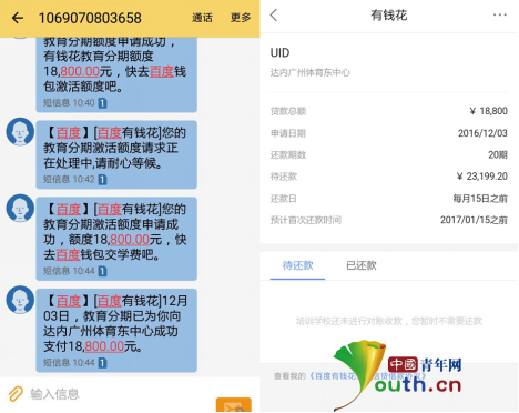 隨后程女士將手機(jī)還給小宜,開始和她聊天。當(dāng)時(shí)手機(jī)里不斷收到短信,小宜說自己出于禮貌,聊天期間沒有看手機(jī);氐郊也虐l(fā)現(xiàn),自己收到的是貸款短信。自己的賬號(hào)通過百度錢包貸了18800元的教育分期貸款,需要分期償還2.3萬元。