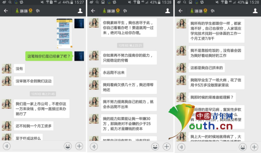 小宜發(fā)現(xiàn)以后,立即與程女士聯(lián)系。而程女士則表示,自己是一家上市公司,“不差你這一萬”,小宜可以周一來退貸款。隨后程女士給小宜講起了自己的和自己學(xué)生的勵(lì)志故事。內(nèi)容包括“我媽看病欠債幾十萬,我還得幫她還”,“我不努力提高我自己的能力,就永遠(yuǎn)爬不出來”,“我的能力如果能讓我一年賺30萬,那我絕不會(huì)賺的少于25萬,能力才是賺錢的資本”!拔宜械膶W(xué)生都跟你一樣,都家境不好,自己也很窮,人家現(xiàn)在學(xué)完技術(shù)找到一份體面的工作一個(gè)工資7/8千”……