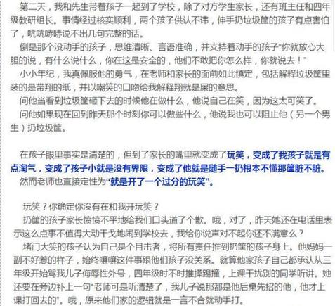 還有網(wǎng)友爆料,首先這孩子姓周,家長通過關(guān)系將孩子硬塞進(jìn)學(xué)校并且要求學(xué)校多加照顧,所以1-3年級班主任對孩子很關(guān)照,到了4年紀(jì)班里換了老教師不吃那套,人人平等,這孩子有落差,家長就要求換班主任學(xué)校不干就結(jié)了梁子,這次的事兒是孩子上廁所小便不小心尿到了那個扔紙簍的孩子身上,所以那個孩子生氣才把紙簍扔他身上,根本不是屎尿扣腦袋上,然后他家長就不干了借題發(fā)揮,事后兩個孩子和家長都道歉了,但是這孩子家長找到教委給學(xué)校施壓要求全校開大會批評那倆孩子,學(xué)校當(dāng)然不干,于是就有了這篇文章。還有網(wǎng)友爆料,首先這孩子姓周,家長通過關(guān)系將孩子硬塞進(jìn)學(xué)校并且要求學(xué)校多加照顧,所以1-3年級班主任對孩子很關(guān)照,到了4年紀(jì)班里換了老教師不吃那套,人人平等,這孩子有落差,家長就要求換班主任學(xué)校不干就結(jié)了梁子,這次的事兒是孩子上廁所小便不小心尿到了那個扔紙簍的孩子身上,所以那個孩子生氣才把紙簍扔他身上,根本不是屎尿扣腦袋上,然后他家長就不干了借題發(fā)揮,事后兩個孩子和家長都道歉了,但是這孩子家長找到教委給學(xué)校施壓要求全校開大會批評那倆孩子,學(xué)校當(dāng)然不干,于是就有了這篇文章。