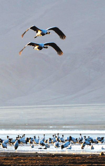 數(shù)據(jù)顯示,在西藏越冬的黑頸鶴數(shù)量逐年增多,數(shù)量已由1995年的3000只上升到目前的近9000只,占全球黑頸鶴總數(shù)的80%以上。