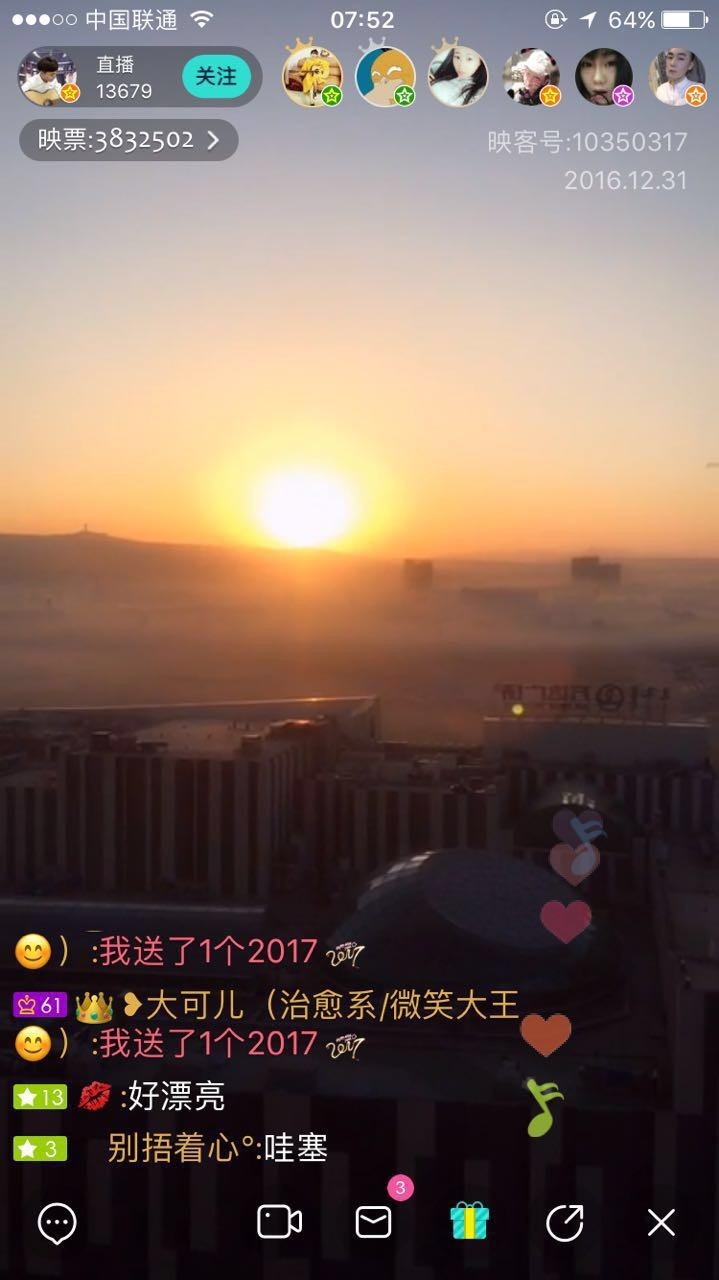 從早上6點(diǎn),來自祖國寶島臺灣的映客主播就開啟了直播,隨著太陽的升起,每一個被陽光點(diǎn)亮的城市都有主播開啟直播。福建、上海、浙江、香港……9點(diǎn)40分,在離海最遠(yuǎn)的城市新疆塔城,來自人民大學(xué)的支教老師們開啟了直播。至此,網(wǎng)友通過直播鏡頭見證了2017年1月1日的太陽升起在祖國每一個角落。