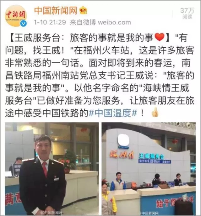 王威是南昌鐵路局福州南站黨總支書(shū)記,從事鐵路一線客運(yùn)工作28年來(lái),以服務(wù)為宗旨、待旅客如親人,以他名字命名的“海峽情 王威服務(wù)臺(tái)”成為一張亮麗的名片。