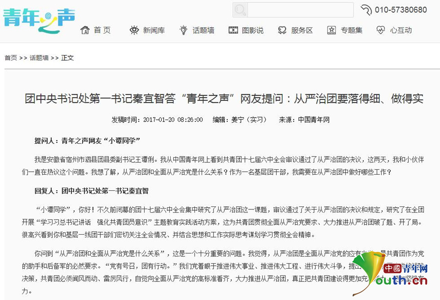 共青團(tuán)中央書記處第一書記秦宜智通過“青年之聲”互動(dòng)社交平臺回答了網(wǎng)友關(guān)于基層團(tuán)干部如果落實(shí)從嚴(yán)治團(tuán)要求的問題。網(wǎng)頁截圖