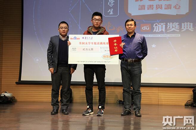央廣網(wǎng)北京1月23日消息 1月22日,百度與南京大學(xué)共同舉辦的“全國大學(xué)生悅讀挑戰(zhàn)賽”隨著頒獎儀式的舉行落下帷幕。百度校園品牌部主任李軒涯、百度校園品牌部副主任計湘婷、百度閱讀總經(jīng)理胡鑫及南京大學(xué)社科處副處長巢乃鵬、南京大學(xué)學(xué)工處副處長蔣恩銘出席了此次典禮并為大賽獲獎選手頒獎。央廣網(wǎng)作為本次活動的媒體合作伙伴,特邀請中央人民廣播電臺主持人馬宗武擔任本次活動主持。此外,頒獎典禮特別邀請到著名文化學(xué)者于丹教授,以“讀書與讀心”為主題分享了自己對閱讀的理解,獲得了觀眾熱烈反響。