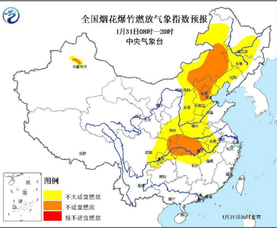 1月31日08時至2月1日08時,華北中南部、黃淮西北部、陜西關中等地空氣污染氣象條件為3級,部分地區(qū)4級。華北中北部等地不適宜燃放煙花爆竹。全國其余大部地區(qū)空氣污染氣象條件較好,有利于污染物的擴散。