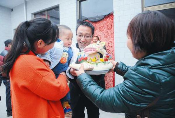 王銀菊將制作好的“虎頭”花饃送給親戚家的孫子。