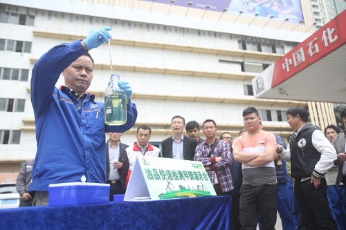 “您可以對比一下,油品摻入水雜,右邊使用除水濾芯后加注出的油樣照樣純凈透亮無雜質(zhì),而左邊的是用一般濾芯加注出的品樣,早已渾濁不堪。”現(xiàn)場解說員候賢武向顧客耐心地演示著除水濾芯的神奇功效。演示過程中,現(xiàn)場使用模擬加油機加出注入大量的水油品,普通濾芯直接將含水油品加出來,流速不減,加油槍仍然正常工作。但是安裝了除水濾芯的加油機,遇到這種情況加油速度明顯變慢,直至濾芯內(nèi)遇水膨脹的材料完全將濾清器堵死,導致加油槍完全加不出油,以此向加油員發(fā)出警示:油品含水。這樣達到兩個目的,一是保證含水油不進入消費者油箱,二是萬一加油站油罐含水,或者是設備設施的原因突然破壞性進水,除水濾芯的反應可以向加油站工作人員發(fā)出警報。目前,深圳石油所有加油站均安裝了能夠有效去除油品中的雜質(zhì)和隔離油品水份的高精度除水紙濾芯,確保清潔的油品加到消費者的油箱,減少汽車發(fā)動機的磨損,延長車輛的使用壽命。該公司通過科技創(chuàng)新的方法把好了油品的最后一道關,真正使消費者用得安全、安心。