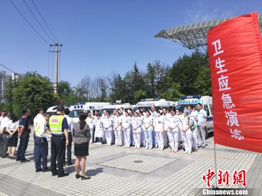 5月12日,汶川地震九周年,成都120舉行緊急醫(yī)療救援演練。圖為演練現(xiàn)場(chǎng)!$娦馈z