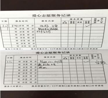 家門口的為老連鎖服務(wù),一點(diǎn)也不馬虎呢,還特別注重老人對服務(wù)的滿意度測評(píng)呢,看這里,這是友愛果園愛心志愿服務(wù)記錄。