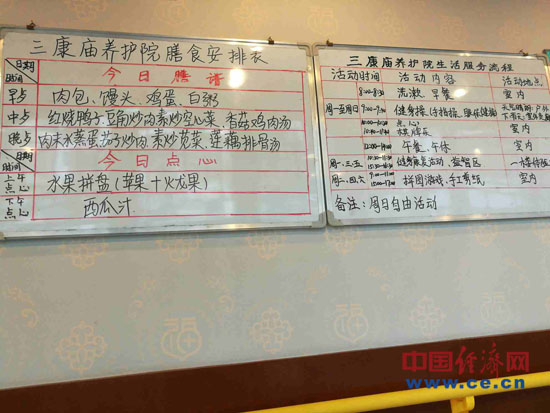 養(yǎng)老中心宿舍區(qū)墻面的白板上,詳細(xì)地列著老人們這一天的膳食和活動(dòng)安排。(中國(guó)經(jīng)濟(jì)網(wǎng)記者范戴芫 攝)