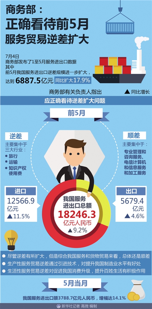 經(jīng)濟(jì)日?qǐng)?bào)北京7月4日訊(記者 馮其予)商務(wù)部4日公布數(shù)據(jù)顯示,1至5月,我國(guó)服務(wù)進(jìn)出口總額18246.3億元人民幣,同比增長(zhǎng)9.2%。其中,出口5679.4億元,增長(zhǎng)4.6%;進(jìn)口12566.9億元,增長(zhǎng)11.5%;逆差6887.5億元。