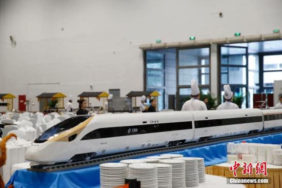 5月14日,“一帶一路”國際合作高峰論壇新聞中心餐廳的高鐵布景。中新社記者 杜洋 攝