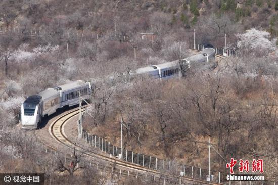 2017年3月26日,北京居庸關(guān)長城腳下,山花漸次盛開,和諧號列車行駛在花海中,駛向春天,美如畫卷。王明允 攝 圖片來源:視覺中國