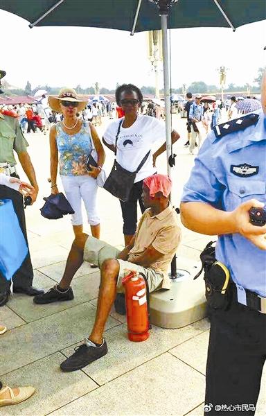北青報(bào)記者注意到,“非洲友人在天安門廣場中暑”的照片,最早由一名微博網(wǎng)友發(fā)出,該網(wǎng)友描述稱,“一名非洲友人在天安門廣場上中暑了”。該微博內(nèi)容隨即引發(fā)熱議。不少網(wǎng)友表示,入伏之后,北京這兩天氣溫高,13日最高氣溫達(dá)到36攝氏度,另外也有不少網(wǎng)友求證此事的真實(shí)性。