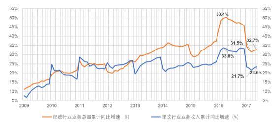 郵政行業(yè)業(yè)務(wù)總量和業(yè)務(wù)收入累計同比增速變化情況