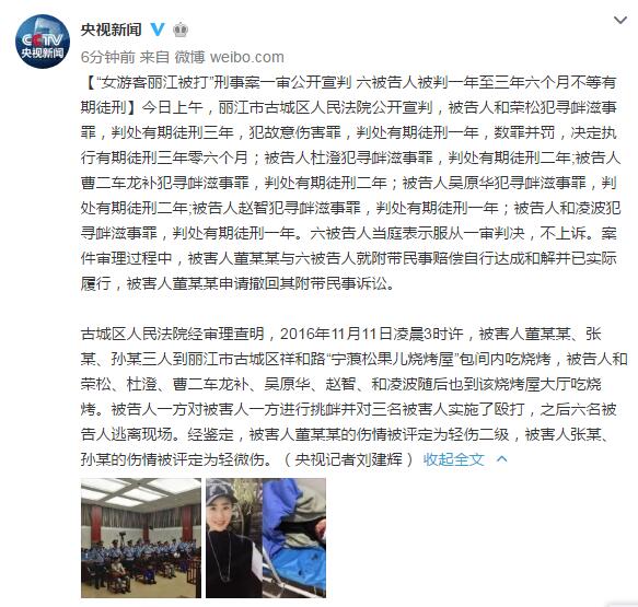人民網(wǎng)北京8月17日電 據(jù)中央電視臺新聞中心官方微博消息,今日上午,麗江市古城區(qū)人民法院公開宣判,被告人和榮松犯尋釁滋事罪,判處有期徒刑三年,犯故意傷害罪,判處有期徒刑一年,數(shù)罪并罰,決定執(zhí)行有期徒刑三年零六個月;被告人杜澄犯尋釁滋事罪,判處有期徒刑二年;被告人曹二車龍補犯尋釁滋事罪,判處有期徒刑二年;被告人吳原華犯尋釁滋事罪,判處有期徒刑二年;被告人趙智犯尋釁滋事罪,判處有期徒刑一年;被告人和凌波犯尋釁滋事罪,判處有期徒刑一年。六被告人當(dāng)庭表示服從一審判決,不上訴。案件審理過程中,被害人董某某與六被告人就附帶民事賠償自行達成和解并已實際履行,被害人董某某申請撤回其附帶民事訴訟。