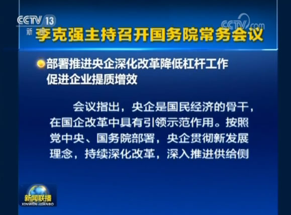 央視網(wǎng)消息(新聞聯(lián)播) 國務(wù)院總理李克強(qiáng)今天(23日)主持召開國務(wù)院常務(wù)會議,部署推進(jìn)央企深化改革降低杠桿工作,促進(jìn)企業(yè)提質(zhì)增效;聽取股權(quán)期權(quán)和分紅等激勵政策落實與科研項目及經(jīng)費(fèi)管理制度改革進(jìn)展情況匯報,推動增強(qiáng)創(chuàng)新發(fā)展動力。