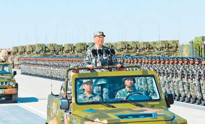 7月30日上午,慶祝中國人民解放軍建軍90周年閱兵在朱日和聯(lián)合訓(xùn)練基地隆重舉行。中共中央總書記、國家主席、中央軍委主席習(xí)近平檢閱部隊(duì)并發(fā)表重要講話。這是習(xí)近平乘車檢閱部隊(duì)。