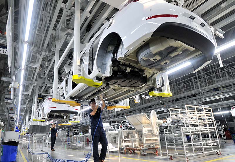 工人在北京現(xiàn)代滄州工廠總裝車間生產(chǎn)線上工作(9月12日攝)。
