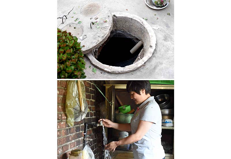 上圖:河北省承德市興隆縣陡子峪鄉(xiāng)瀝水溝村蔡金蓮家以前的雨水窖已經(jīng)不用;下圖:蔡金蓮家用上深井水(拼版照片,2016年9月6日攝)。