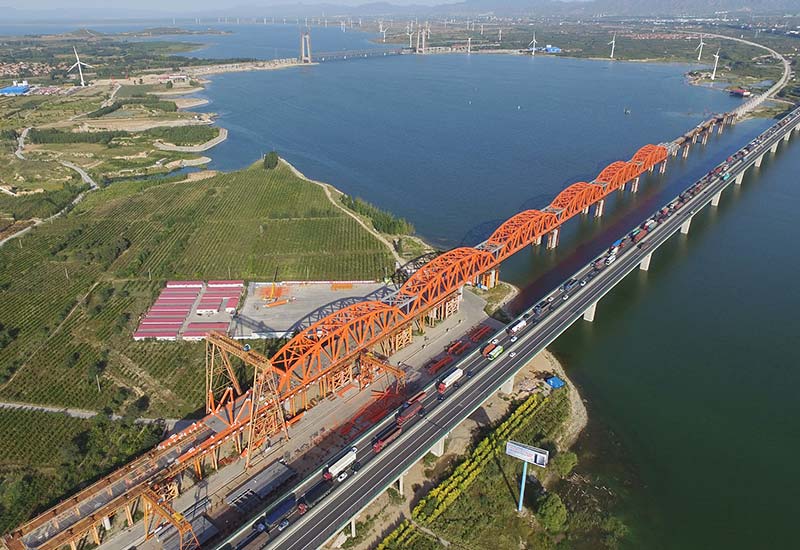 這是建設(shè)中的京張高鐵工程官廳水庫特大橋(9月10日攝)。