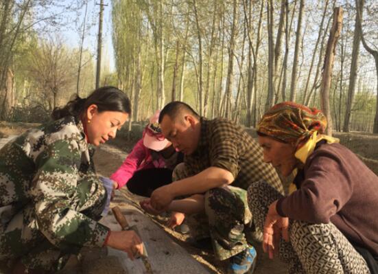 4月,嫩綠的楊樹(shù)葉已站滿了枝頭,正是種菜的好時(shí)節(jié)。工作隊(duì)來(lái)到阿提坎木·依司馬義力老大媽家,遠(yuǎn)遠(yuǎn)地就看見(jiàn)她彎著腰在菜地里干活兒。大家連忙拿起小鐵鏟和菜種子,幫她種菜。不一會(huì),白色地膜上就留下了一排排整齊的小土堆?吹近h華身上有土,大媽連忙拿了個(gè)小掃帚幫她掃,那種和藹溫柔的眼神,儼然像一個(gè)母親對(duì)待一個(gè)調(diào)皮的孩子。臨走的時(shí)候,老大媽拉著黨華的手說(shuō):“你就像我的丫頭一樣。”黨華連忙對(duì)大媽說(shuō):“以后我就是您的孩子,會(huì)經(jīng)常來(lái)看您的!睆哪且院,黨華也真正把老大媽當(dāng)成了親人。黨華每次在村委會(huì)遇到老大媽,都會(huì)熱情地把老大媽接到宿舍來(lái)坐一會(huì)。
