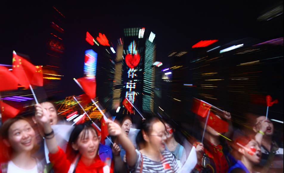 眾多熱心網(wǎng)友來到外灘,他們揮舞著五星紅旗,在黃浦江邊共同唱響這首心中的歌:《我愛你,中國!》