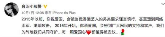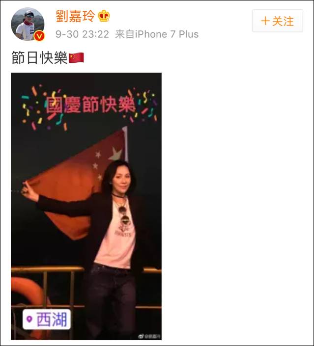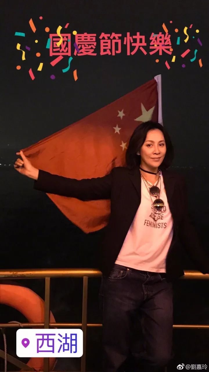 香港演員劉嘉玲9月30日晚就發(fā)布了祝大家國慶節(jié)快樂的微博,并附上自己與五星紅旗合影的照片。