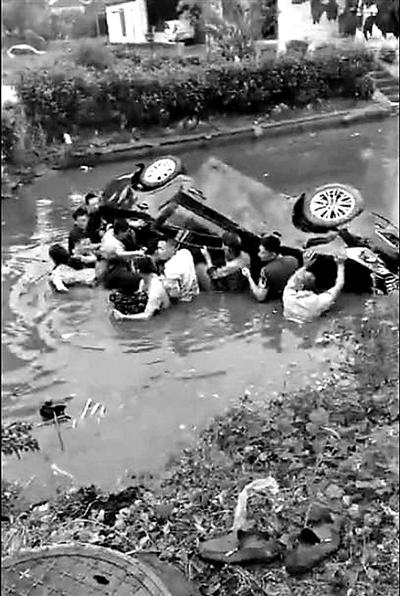 10月1日一早,上海的陳先生帶著父母、愛(ài)人和孩子一家五口驅(qū)車返回江蘇啟東市通興縣的老家,卻沒(méi)想到在路上和另外一輛白色小轎車發(fā)生碰撞,陳先生一家連車帶人翻入了路邊的一條小河里,河水迅速灌進(jìn)車內(nèi),而就在這時(shí),路邊的11名村民跳入水中砸窗救人,最終將陳先生一家五口人全部從車內(nèi)救了出來(lái)。