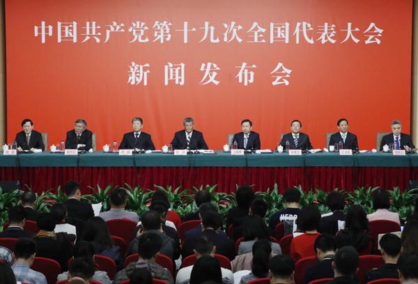 10月26日,中國共產(chǎn)黨第十九次全國代表大會新聞發(fā)言人庹震召開專題新聞發(fā)布會,請中央紀委副書記肖培,中央政策研究室常務(wù)副主任、中央宣傳部副部長王曉暉,中央文獻研究室主任冷溶,國務(wù)院法制辦公室黨組書記、副主任袁曙宏,中央財經(jīng)領(lǐng)導(dǎo)小組辦公室副主任楊偉民,中央紀委駐國資委紀檢組組長、國資委黨委委員江金權(quán)解讀十九大報告,并回答記者提問。(新華社記者 沈伯韓 攝)