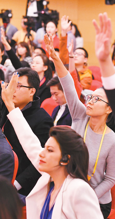 在十九大新聞中心舉行的記者招待會(huì)上,中外記者在提問(wèn)。本報(bào)記者 雷 聲攝