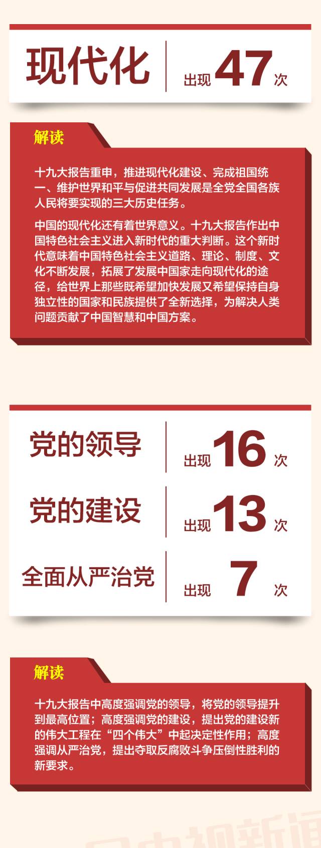 十九大報告中,許多重要關(guān)鍵詞被反復提及!靶聲r代”一詞首次出現(xiàn)在報告中,出現(xiàn)頻率也達到了30余次。此外,“中國特色社會主義”、“現(xiàn)代化”、“黨的領(lǐng)導”等詞也在報告中占據(jù)了重要的位置。