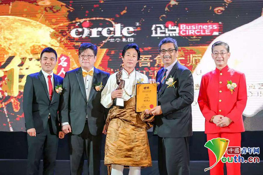 2016年,夏吾角(中)被馬來西亞“世界杰出名人榜”授予“終身成就獎”,成為繼中國著名表演藝術之家六小齡童之后,第二個獲此殊榮的中國人。受訪者供圖