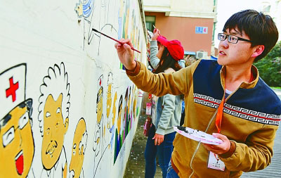 11月6日,志愿者在小區(qū)的墻上繪制解讀十九大精神的漫畫。石玉成攝/光明圖片