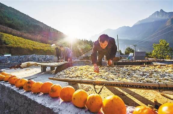 11月8日,蘭英村周家坪,村民正在自家房頂翻曬蘿卜片。