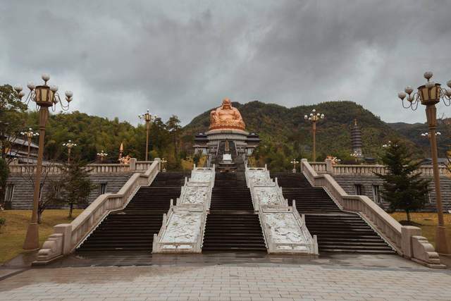 采風(fēng)團(tuán)來到位于雪竇山山心的雪竇寺,遠(yuǎn)遠(yuǎn)地便見到世界最高的彌勒大佛盤坐山間,笑容可掬地迎接著大家。這座彌勒佛像身高33米,蓮花座高9米,通高56.74米,是目前的“世界之最”。