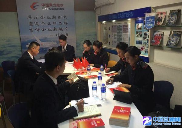 新藍(lán)網(wǎng)-中國(guó)藍(lán)新聞客戶(hù)端12月1日訊(記者王逸群 俞笛)11月30日上午,東航客艙部準(zhǔn)備室內(nèi)的桌面上擺滿(mǎn)了黨章、學(xué)習(xí)文件和筆記本,由上海飛往長(zhǎng)沙的航班乘務(wù)組人員正在利用出發(fā)前的時(shí)間學(xué)習(xí)黨的十九大精神和近期的新聞。他們有一個(gè)共同的身份——東航“藍(lán)天黨小組”成員。