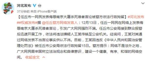 據(jù)河北省人民政府新聞辦公室官方微博消息,13日,河北任丘一網(wǎng)民在網(wǎng)絡上發(fā)表侮辱南京大屠殺死難者言論,任丘市公安局依法將違法嫌疑人王某傳喚至公安機關,王某對其不當言論事實供認不諱,目前,王某被依法行政拘留15日。