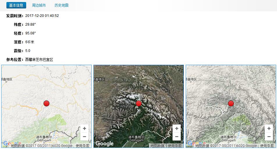 據(jù)中國地震臺網(wǎng)中心網(wǎng)站消息:西藏林芝市巴宜區(qū)12月20日1時40分發(fā)生5.0級地震,震中位于北緯29.88度、東經(jīng)95.08度,震源深度6公里。