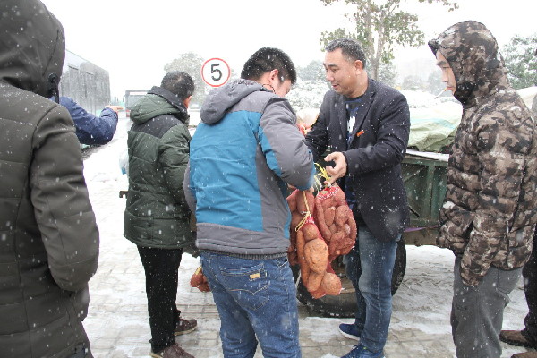 “當(dāng)時(shí)看到有個(gè)機(jī)動(dòng)三輪車停在路邊,看著像是賣菜的車子,一個(gè)老人和一個(gè)小伙子在車邊凍的直搓手,我就想著下去看看!编嵵莨籅6路公交車調(diào)度員孫長偉說,他當(dāng)時(shí)正在上班的路上,看到了停在路邊的機(jī)動(dòng)三輪車。簡單詢問后,孫長偉了解到,這是一對(duì)父子,5天前從開封來到鄭州賣紅薯,不料遇到大雪,紅薯一直沒有賣完,父子倆也無法回家,只能在寒風(fēng)中不住的嘆氣,當(dāng)時(shí)已經(jīng)近14:00時(shí),父子倆還沒有吃飯。