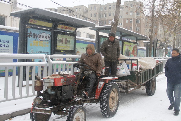 1月4日下午,鄭州街頭雪花紛飛,行人行色匆匆。在電廠路五龍口南路的交叉口,一輛機(jī)動(dòng)三輪車停在路邊,車上蓋著棉被以及塑料布,一位老人和一個(gè)小伙子在旁邊不住的跳腳,和街上行色匆匆的人群格格不入。