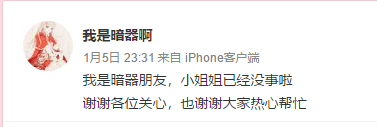 昨天半夜,小姐姐的朋友通過她微博回應(yīng),她已經(jīng)沒事了,謝謝各位的關(guān)心,也謝謝大家的熱心幫忙。