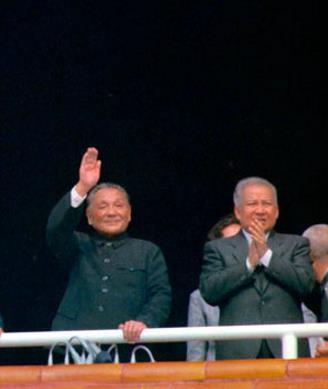 1984年國(guó)慶慶典上,鄧小平與西哈努克親王在觀禮臺(tái)上