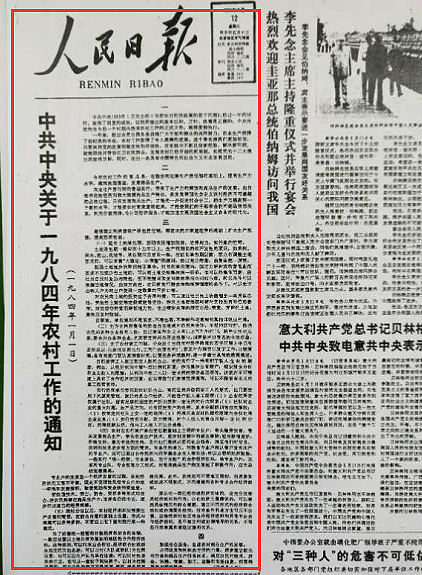 1984年6月12日,《人民日?qǐng)?bào)》刊登《中共中央關(guān)于一九八四年農(nóng)村工作的通知》