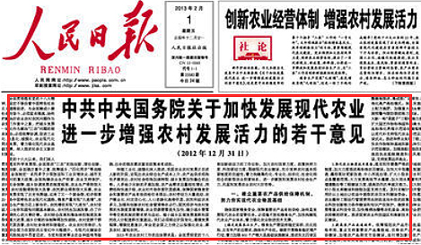 2013年2月1日,《人民日?qǐng)?bào)》刊登《中共中央國(guó)務(wù)院關(guān)于加快發(fā)展現(xiàn)代農(nóng)業(yè) 進(jìn)一步增強(qiáng)農(nóng)村發(fā)展活力的若干意見(jiàn)》