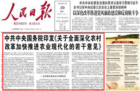 2014年1月20日,《人民日?qǐng)?bào)》刊登《中共中央國(guó)務(wù)院印發(fā)<關(guān)于全面深化農(nóng)村改革加快推進(jìn)農(nóng)業(yè)現(xiàn)代化的若干意見(jiàn)>》