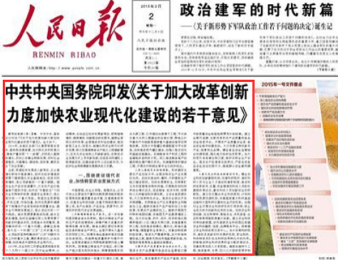 2015年2月2日,《人民日?qǐng)?bào)》刊發(fā)《中共中央國(guó)務(wù)院印發(fā)<關(guān)于加大改革創(chuàng)新力度 加快農(nóng)業(yè)現(xiàn)代化建設(shè)的若干意見(jiàn)>》