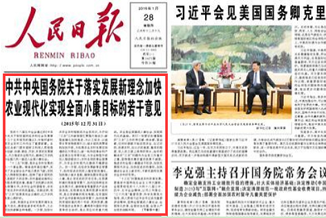 2016年1月28日,《人民日?qǐng)?bào)》刊發(fā)《中共中央國(guó)務(wù)院關(guān)于落實(shí)發(fā)展新理念 加快農(nóng)業(yè)現(xiàn)代化 實(shí)現(xiàn)全面小康目標(biāo)的若干意見(jiàn)》