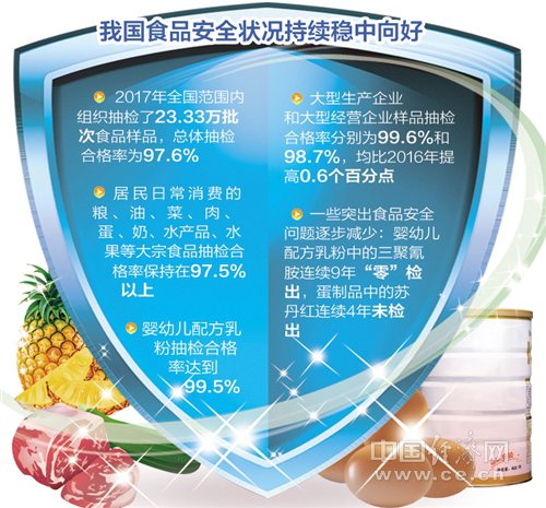 備受消費者關注的嬰幼兒配方食品合格率又有提高。數(shù)據(jù)顯示,2017年嬰幼兒配方乳粉抽檢合格率為99.5%,比2016年提高0.7個百分點,不合格項目主要集中在標簽標識方面。此外,過去比較突出的食品安全問題也在逐步減少。2017年“超范圍、超限量”使用食品添加劑的問題比上年下降了0.6個百分點。同時,非法添加非食用物質(zhì)問題也逐步得到遏制,比如,嬰幼兒配方乳粉中的三聚氰胺,相關部門已連續(xù)9年“零”檢出;蛋制品中的蘇丹紅,也連續(xù)4年沒有檢出。