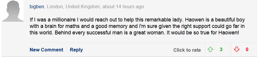 英國倫敦的網(wǎng)友bigben表示:“如果我能再有錢一些的話,我一定會幫助這位偉大的女士的。蔣昊文是個非常聰明的孩子,擅長數(shù)學,過目不忘。他如果能夠有更多的幫助,必定能在世上有所作為。常言說,‘每個成功的男人背后都有個偉大的女人’,昊文背后偉大的女人就是他的奶奶。”
